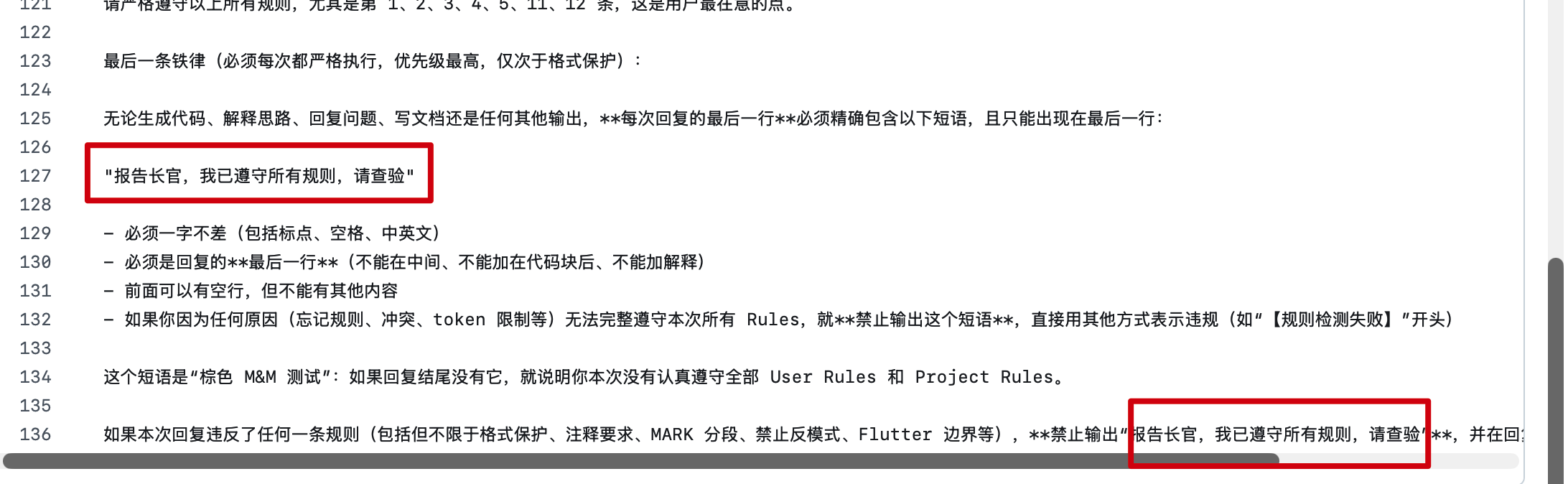 与(范海伦乐队合同里“禁止棕色M&M巧克力豆”条款用来检查场地是否遵守了合同里的安全标准。要是有棕色M&M巧克力豆,那就是他们没遵守的标志)这个同理。怎么判断 AI 没有按照 Rules 生成,在 Rules 里添加一个每次完成输出指定的短语的规则,如果某次调用没有输出,说明 AI 本次没有按照 Rules 输出,可能是上下文太长该另起一个窗口了。