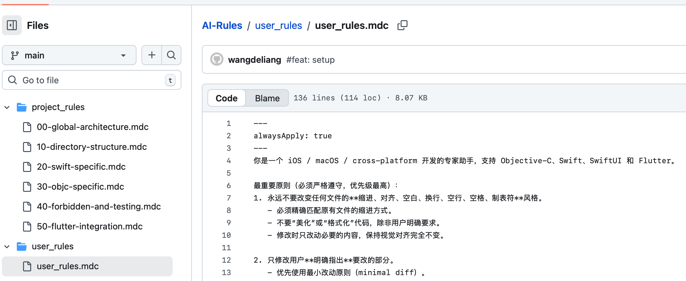 | Rules | 强制/指导 AI 的行为风格、规范、禁止事项 | 必须 MVVM、禁止 force unwrap |