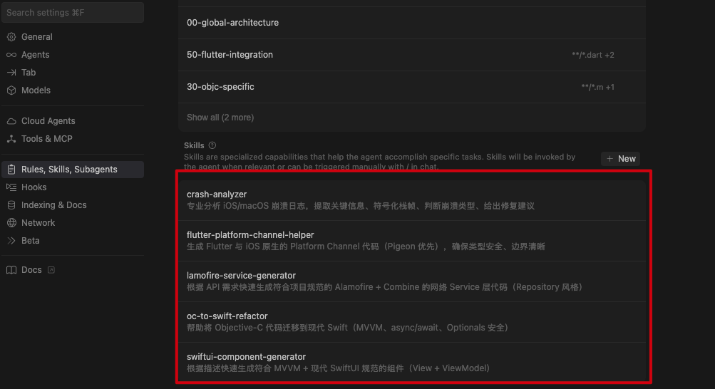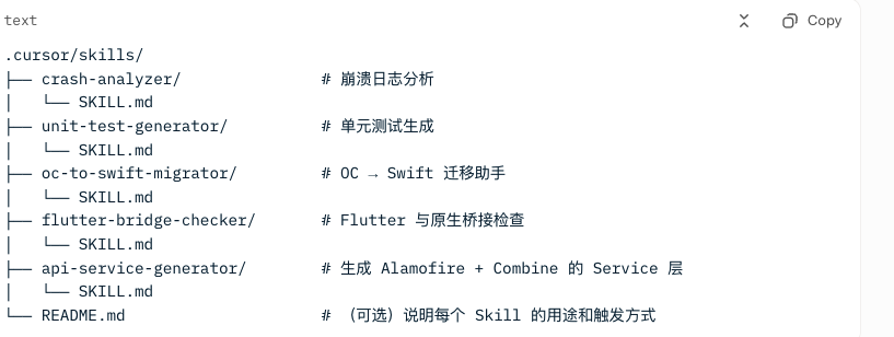 - 重复性强:某些频繁使用 的 Prompt 描述了固定的工作流(如 OC → Swift 迁移、埋点检查、逻辑同步),Skills 可以打包提示词 + 规范,确保每次执行都遵守项目 Rules(MVVM、SnapKit、网络层等)。