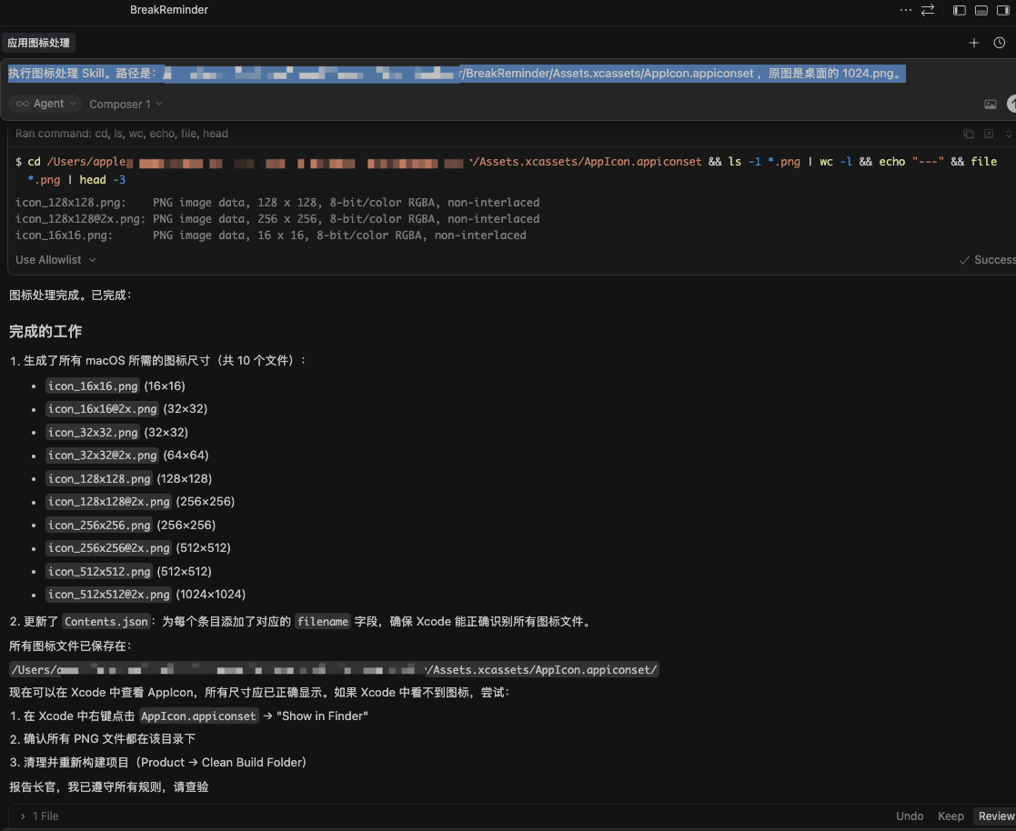 然后我打开了一个本地的 Mac APP 项目,删除了 Assets 的图标,把 1024 的图片放到桌面,然后 Cursor 执行,输入指令,一键检测当前项目,生成了所需的所有图标,如下图: