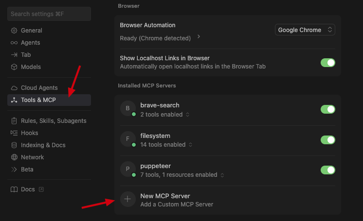 打开 Cursor 的设置,找到 Tools & MCP,然后点击添加 MCP Server,如下图